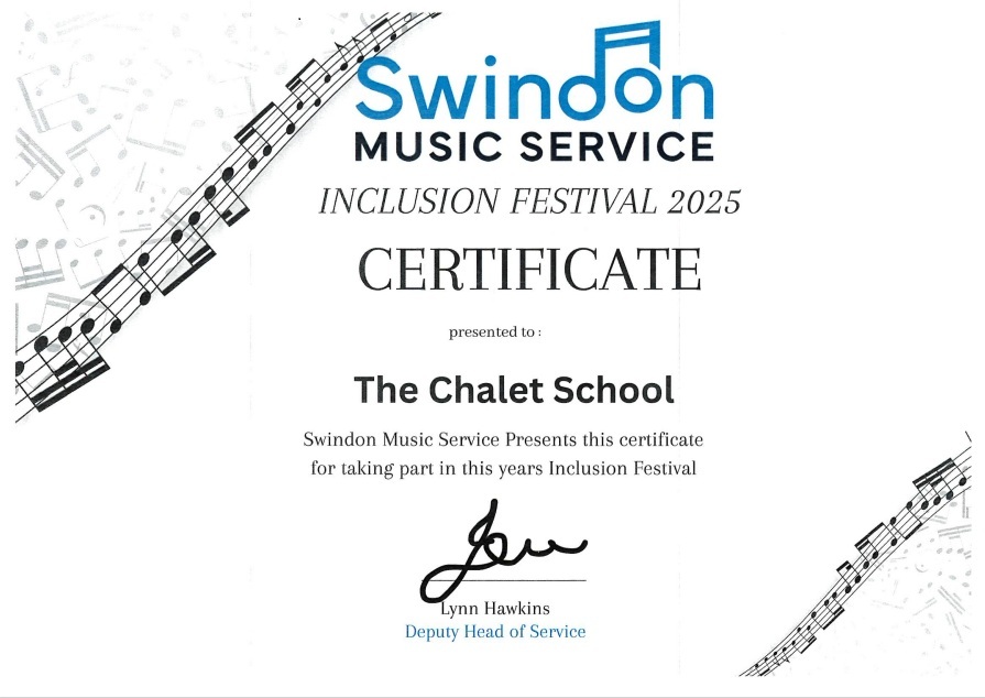 The Chalet School Choir received a lovely certificate from the Swindon Music Service for participating in the Inclusion Festival 2025