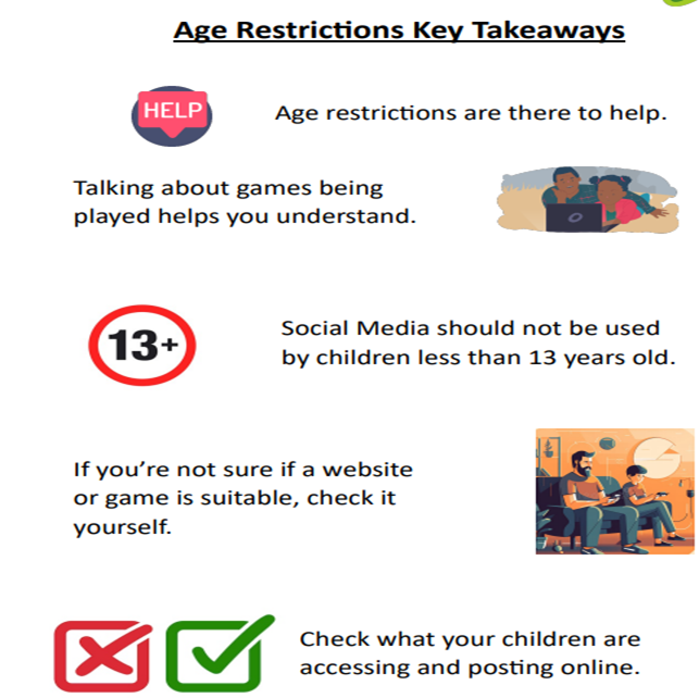Age Restrictions Understanding legal ages for social medial platforms, online video and gaming can be tricky because of how much digital content there is online. Most people do not talk about Computing and online safety at home. Communicating regularly with your child is the greatest tool to keep them safe online.